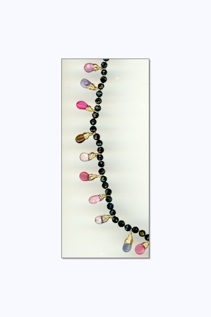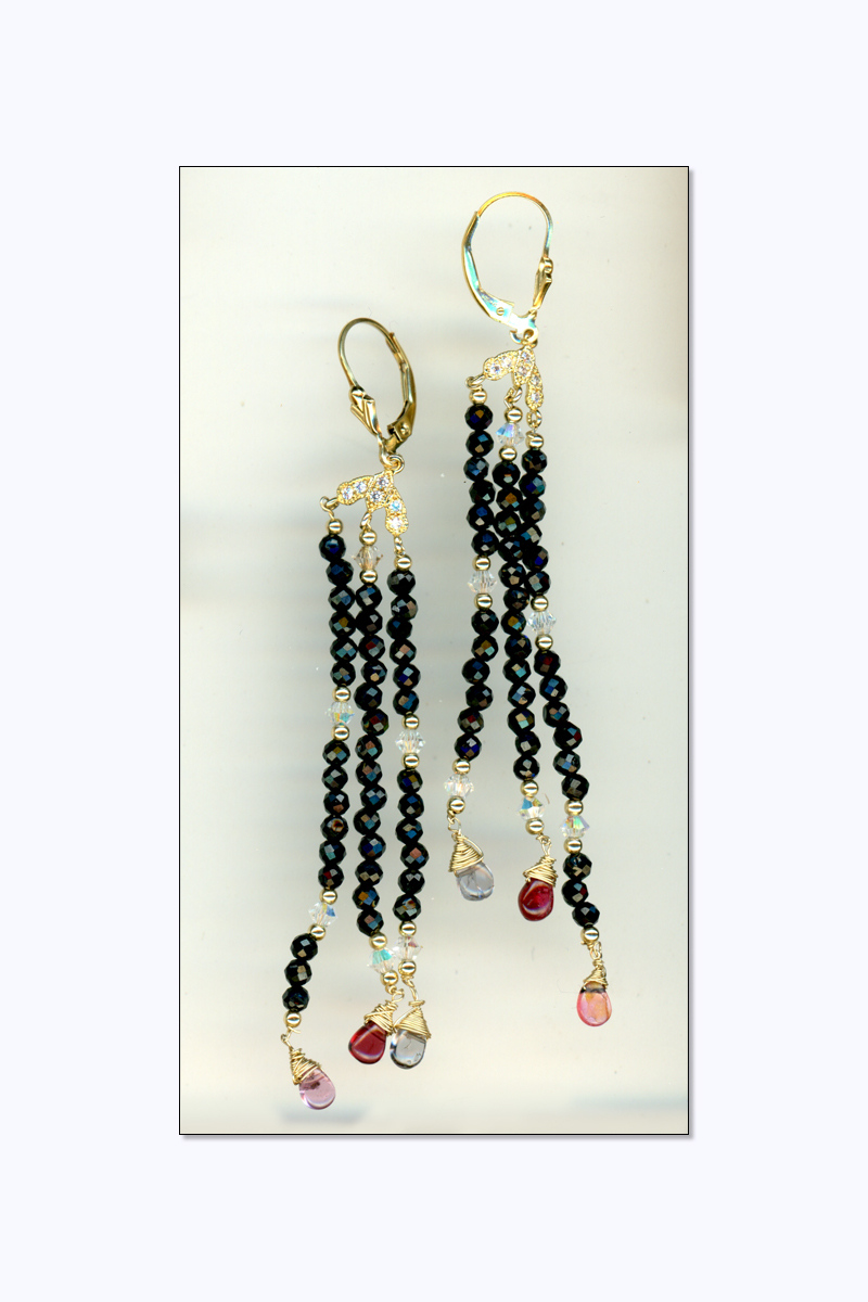 A bib necklace is a small lariat, so-called because it doesn't have a clasp and can be worn at different lengths and directions. 14⁄20 gold-filled wire-wrapped multi-color and black spinel teardrops are hand-knotted with hand-faceted 3-4mm black spinel beads. Findings and round beads are 14⁄20 gold-filled. Earrings set with CZs, strung on 14⁄20 gold-filled wire with faceted round, black spinel beads, AB crystal bicones, and more 14⁄20 gold-filled wire-wrapped spinel teardrops.