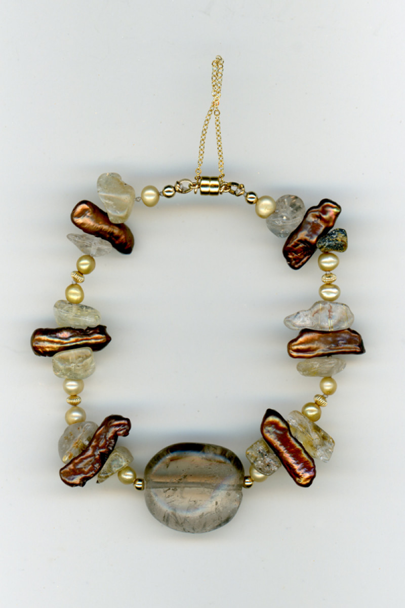 An 18×30mm nugget of smoky quartz with “ghosts” (inclusions) is hand-knotted with chips of golden rutilated quartz. Chinese freshwater champagne potato pearls and bronze stick pearls are accented with corrugated 14⁄20 gold-filled rondelles and 3mm round beads. The findings and magnetic clasp with safety chain are 14⁄20 gold-filled.