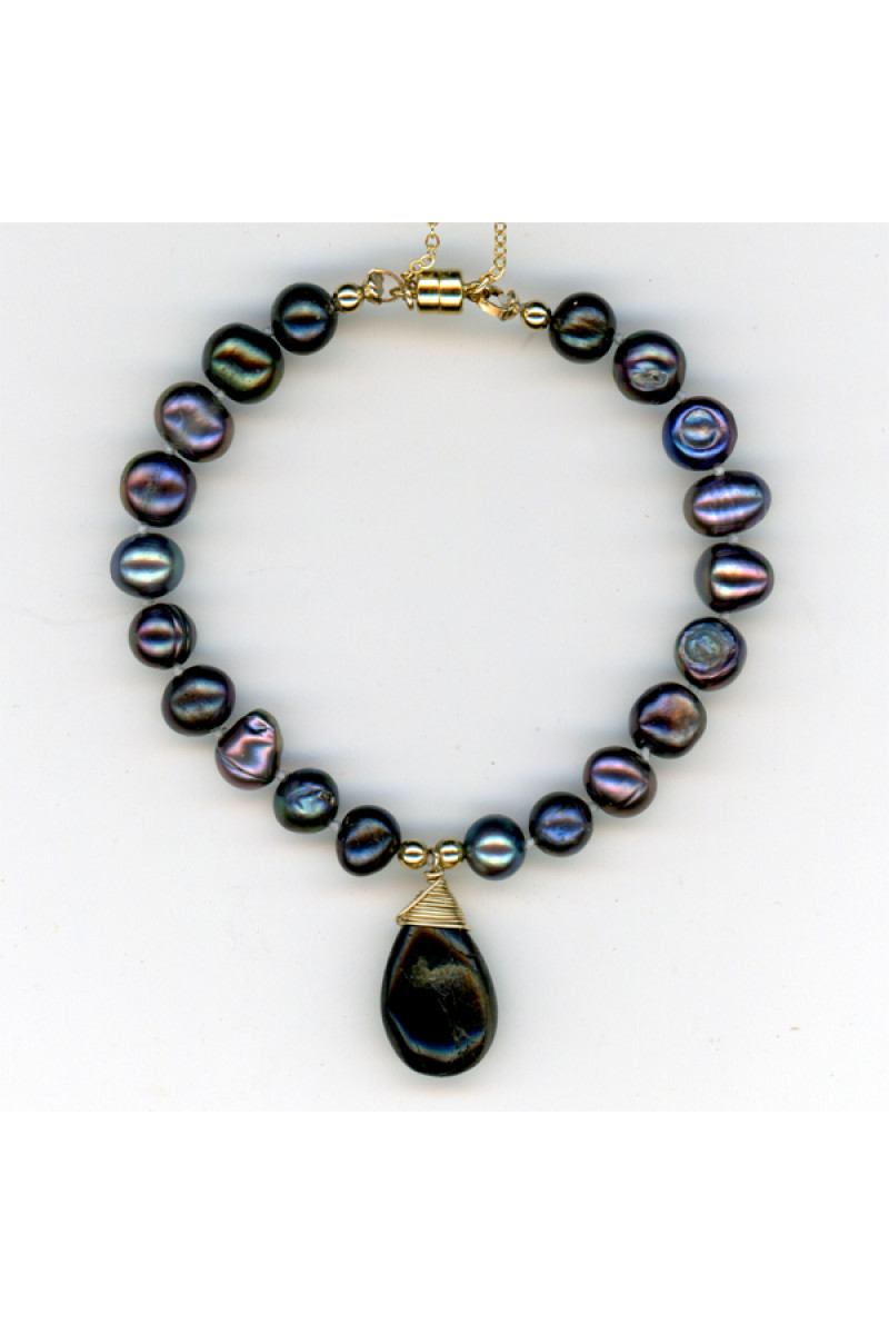6mm peacock black Chinese potato pearls are hand-knotted with a teardrop of iolite with a 14⁄20 gold-filled wire wrap. The round beads, findings and magnetic clasp with safety chain and wire wrap are 14⁄20 gold-filled.