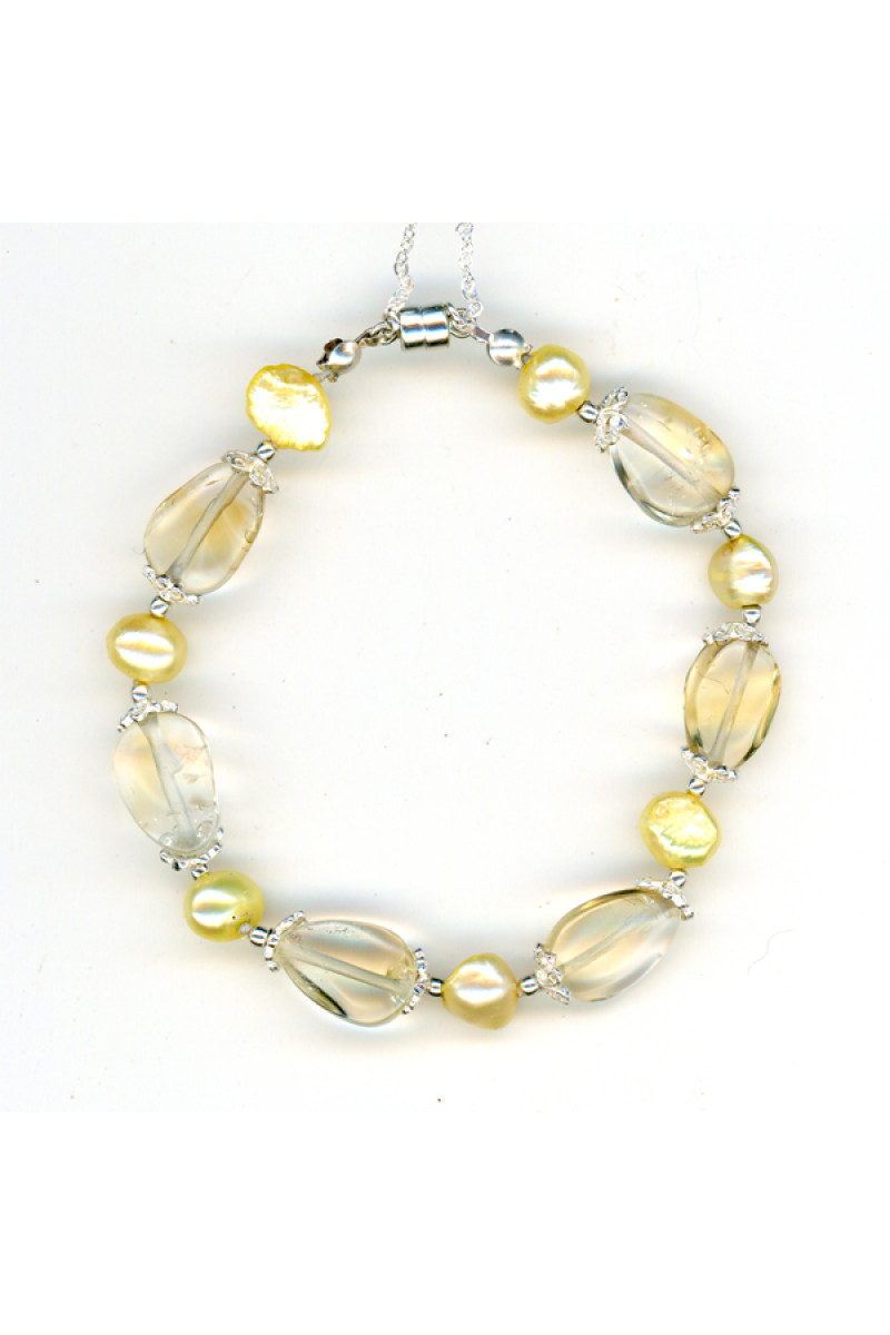 Pale lemon yellow citrine teardrop beads are hand-knotted with jonquil-dyed Chinese freshwater baroque pearls. The bead caps, round beads and magnetic safety clasp with safety chain are sterling silver.